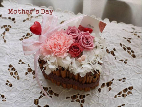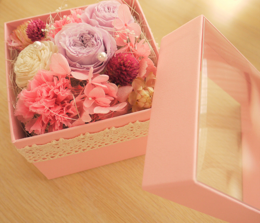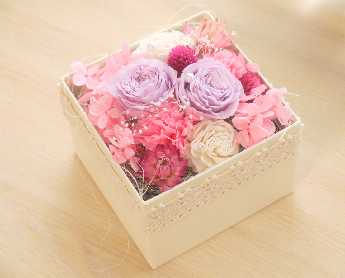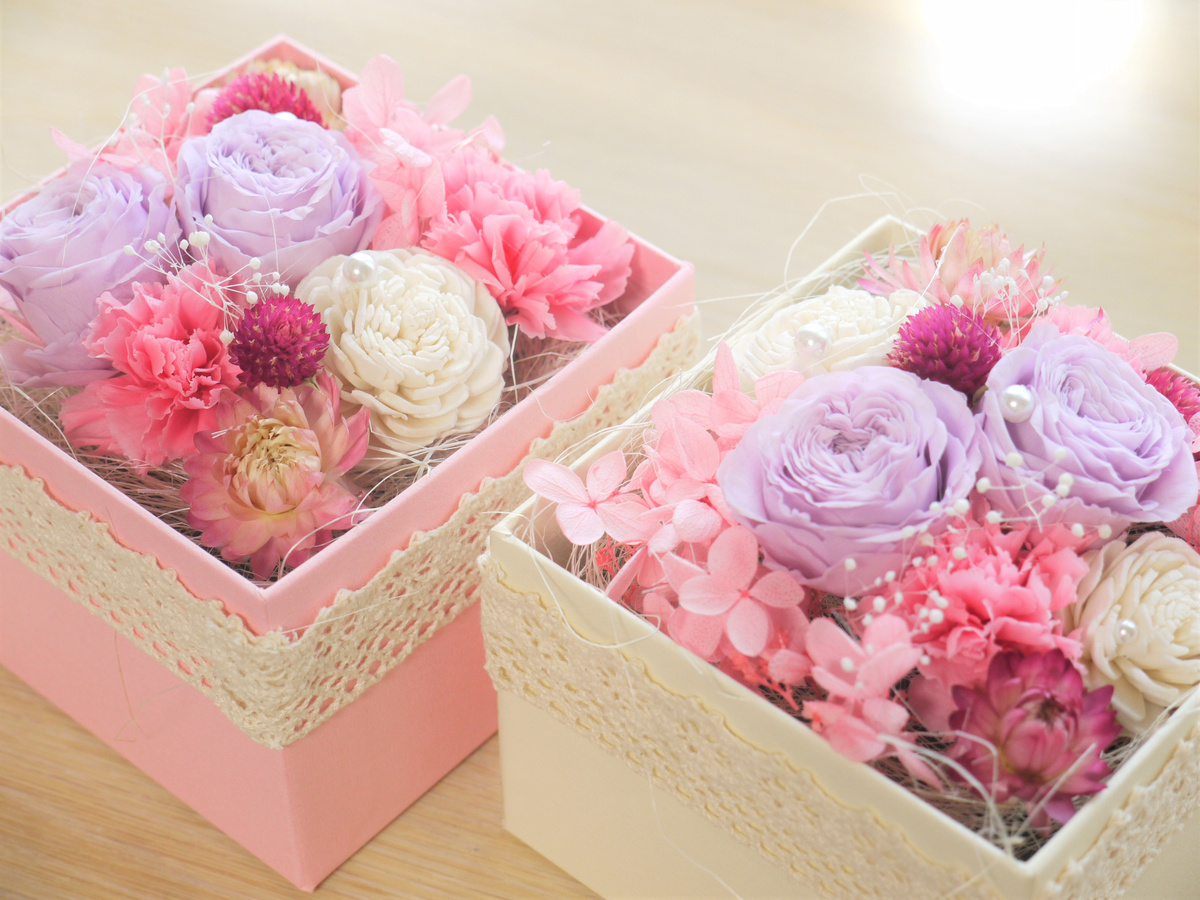 プリザーブドフラワーとドライフラワーを使った作品です。ピンクとホワイトのボックスを選べます。